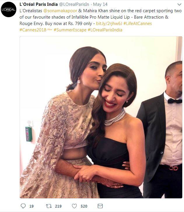 This photo has been shared on cosmetic brand Lorial India's Twitter handle. Its captions have been written in Sonam Kapoor and Mahirah Khan Shining on Red Carpet.